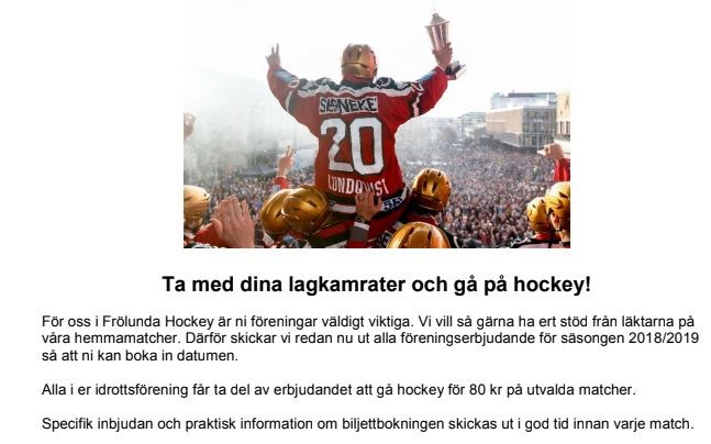 Hej, här är ett föreningserbjudan från Frölunda Hockey. Någon frivillig behöver ta på sig att administrera erbjudandet för hela föreningen: För att ta del av erbjudandet till Linköpingsmatchen den 3 november mailas beställning till kontakt@frolundaindians.com Beställningen ska innehålla exakt antal biljetter och vilken förening det gäller. Den ska vara hos oss senast måndagen den 29 oktober. Varje förening måste göra en gemensam beställning. Biljetterna till matchen hämtas på Frölundas kontor på Campus, Frölundaborg från kl. 09.00 onsdagen den 31 oktober. Uddevalla Hockey Club 23 okt 2018 0kommentarer
